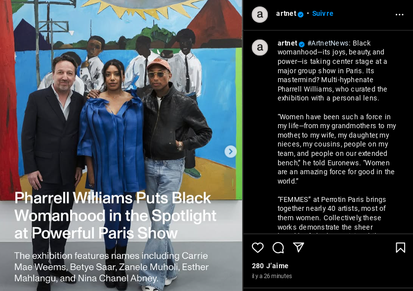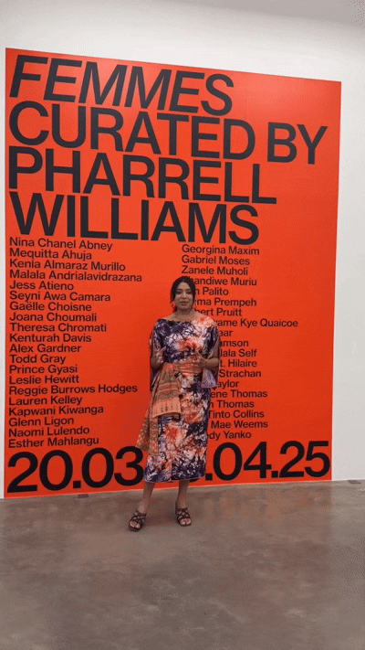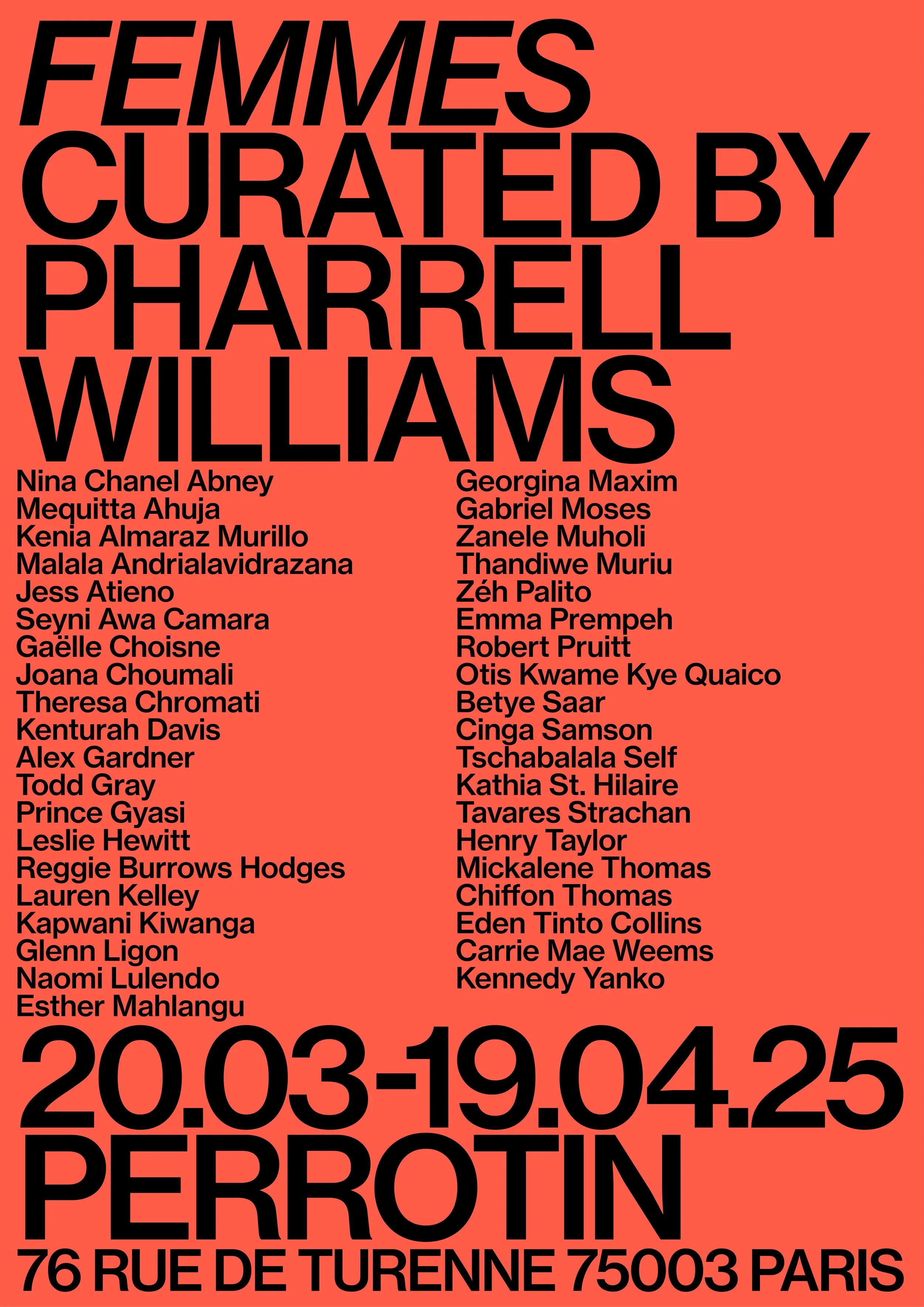 “Curated by Pharrell Williams and hosted by Emmanuel Perrotin’s Parisian gallery, the exhibition FEMMES builds on and expands from their past common endeavors. It follows the success and focus of the 2014 group show GIRL at Perrotin Paris, inspired by Pharrell’s eponymous hit album. As Black women are important figures of Williams’ personal inspiration, their kaleidoscopic representation is the core matrix of FEMMES, with at its foundation, the work of 39 artists of African descent across generations.”
