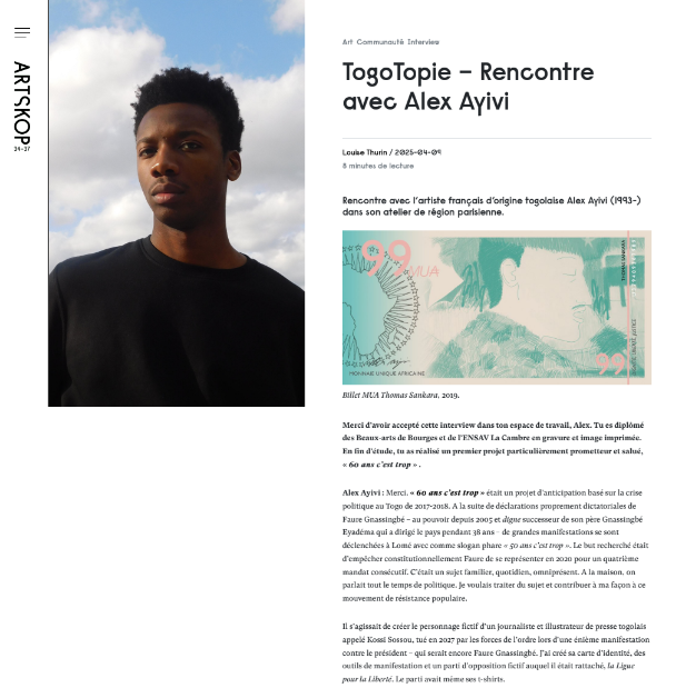 In a 2025 interview I conducted for magazine Artskop3437, French-Togolese artist Alex Ayivi delves into his project "60 ans c’est trop", a fictional yet politically resonant narrative envisioning Togo’s future through the eyes of journalist Kossi Sossou, who stands in defiance of President Faure Gnassingbé. Through silkscreen prints on cardboard—materials evocative of grassroots protest—Alex captures the immediacy of political dissent, layering his work with visual elements inspired by the relentless rhythm of news media. The project confronts themes of dictatorship, resistance, and the potent role of visual storytelling in social movements.