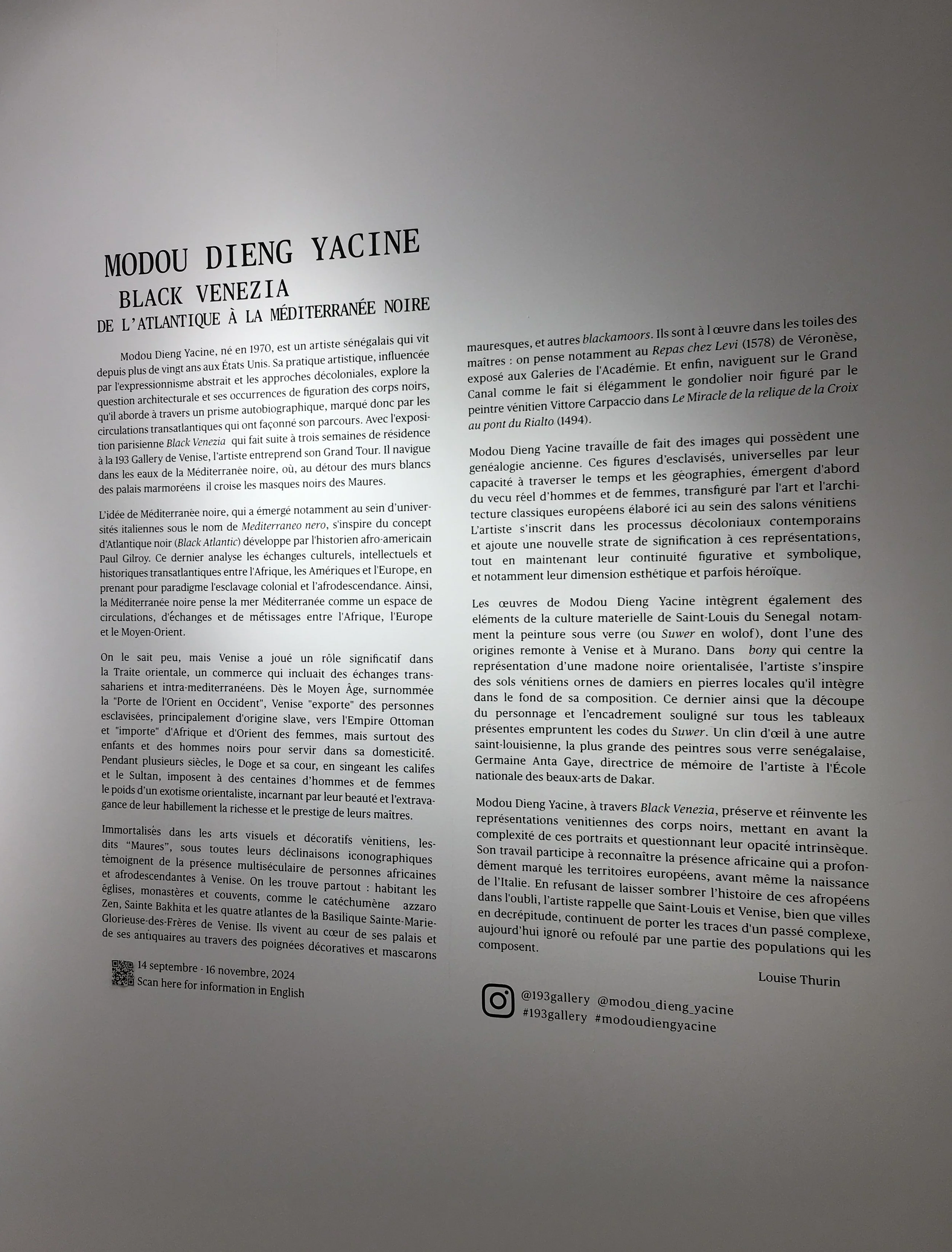 The exhibition Black Venezia. De l’Atlantique à la Méditerranée noire. was on view at the 193 Gallery in Paris from September 14 to November 16, 2024.