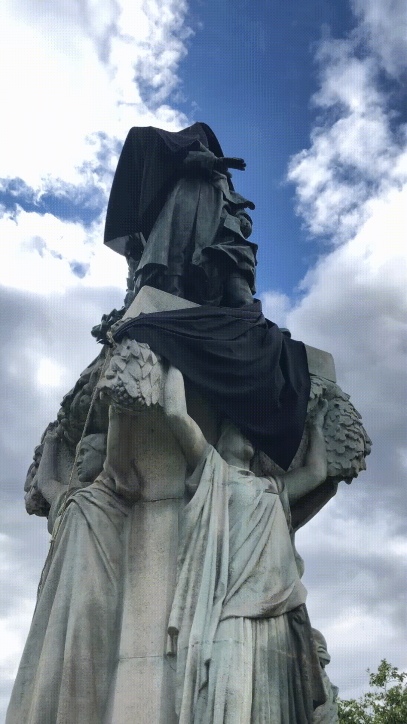 I contributed viral footage I filmed and edited of activist actions involving, among others, Seumboy Vrainom (Histoires Crépues), Françoise Vergès, and Vikash Dhorasoo on June 18, 2020, during the tagging and “draping in black” of the statue of Marshal Gallieni on Place Vauban in Paris.